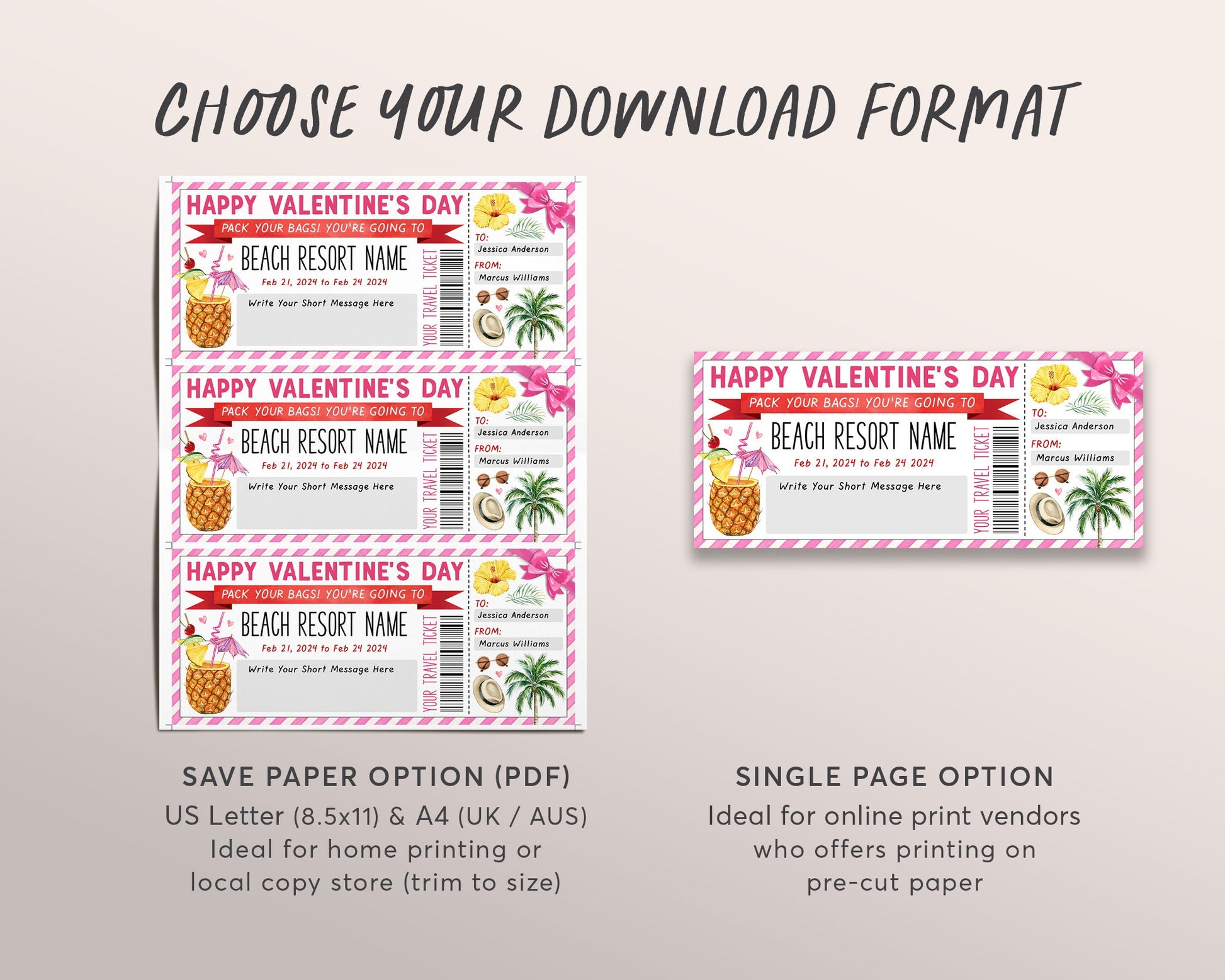 Beach Resort Vacation Travel Ticket Editable Template, Valentines